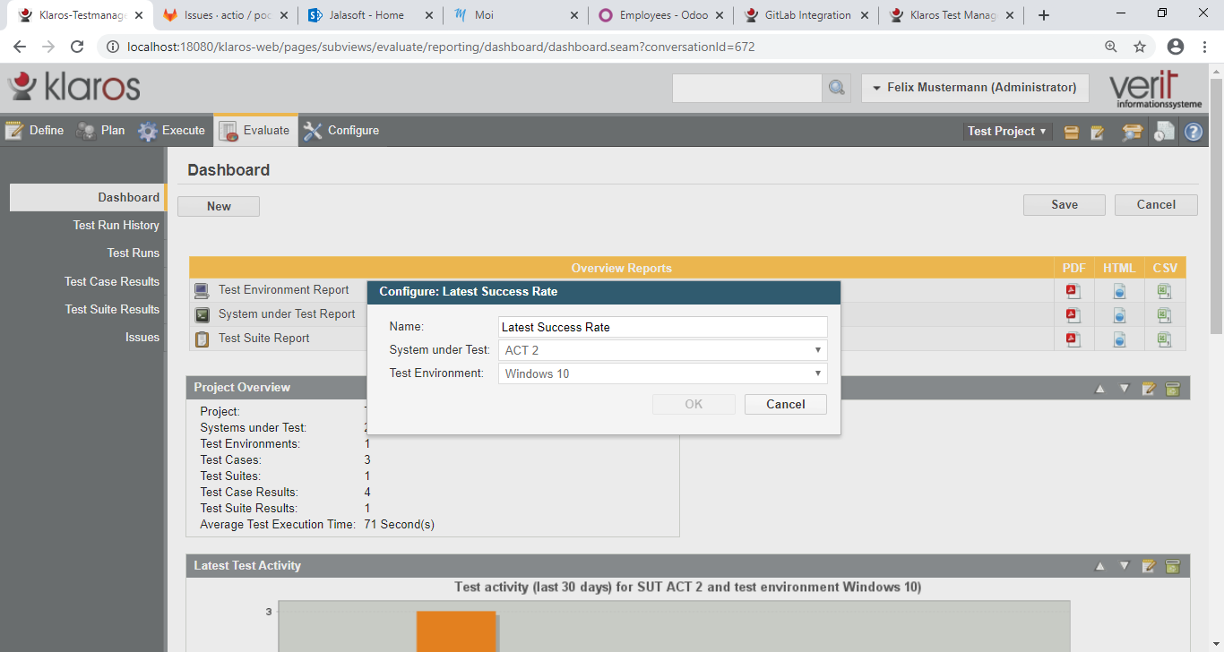 When attempting to create or modifying the Latest Success Rate or the Latest Activity reports on the dashboard, is not possible to change the values of the Test Environment and the System Under Test lists in the options. Is this a bug or a limitation of the Community Edition of Klaros?