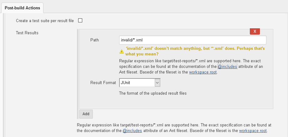 The idea is to point the Path to the test result files which your Jenkins job is producing in it's workspace. Typically they are already present from the last build of your Jenkins job. If not you can specify the location regardless of the validation message.