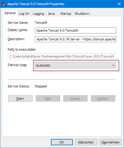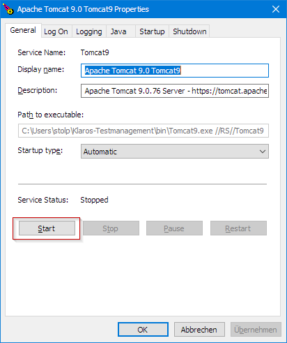 - Return to tab 'General', apply the changes and start the service