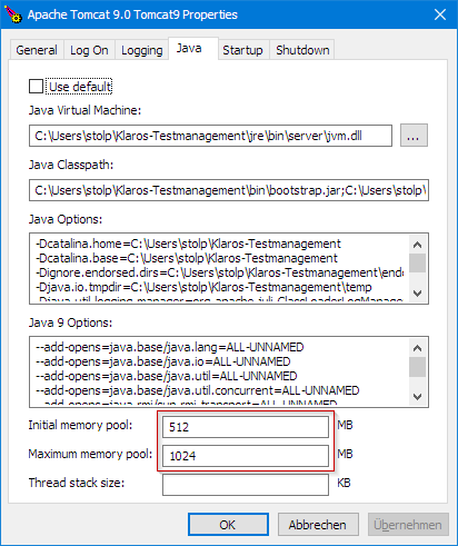 - In tab 'Java' set the memory pool parameters